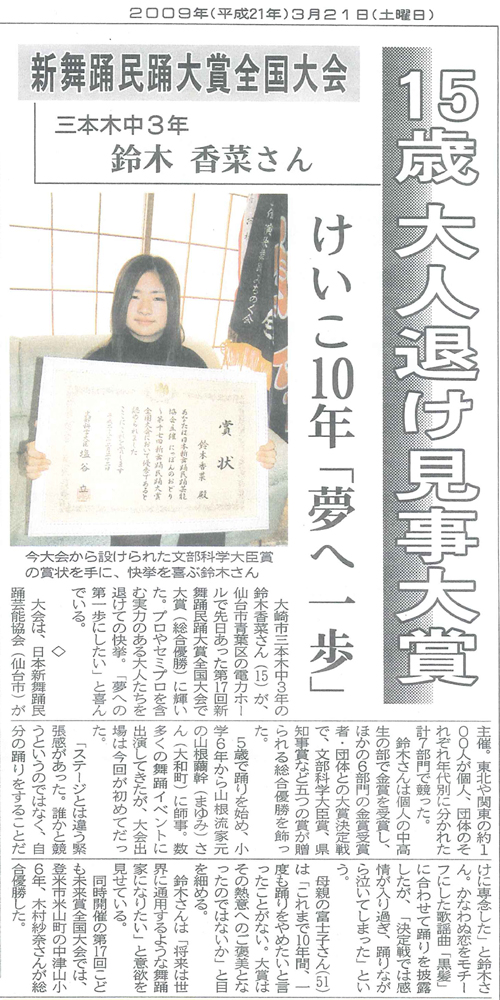 平成21年 2月22日(土)・23日(日)、2日間に渡り電力ホールで行われた、にっぽんの踊「新舞踊民謡大賞全国大会」で、山根流の門下生【鈴木香菜(名取・山根繭花)】が大賞を獲得、文部科学大臣賞に輝きました。